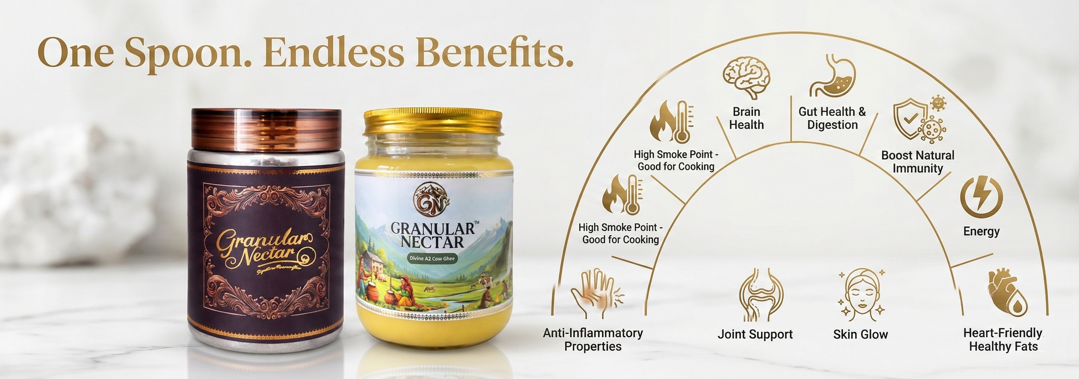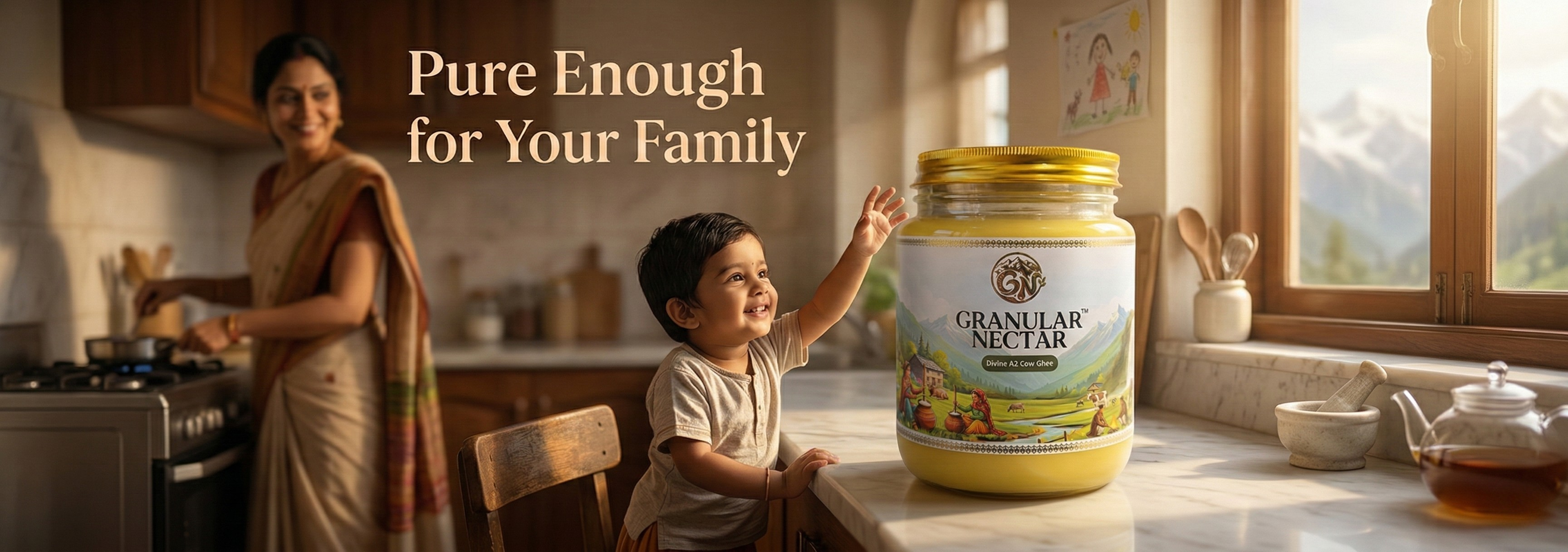Our A2 Cow Ghee is crafted using the ancient Bilona method, where curd is hand-churned into makhan and slowly simmered to preserve nutrition, aroma, and authentic taste.